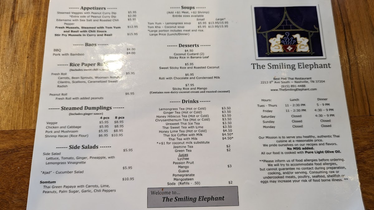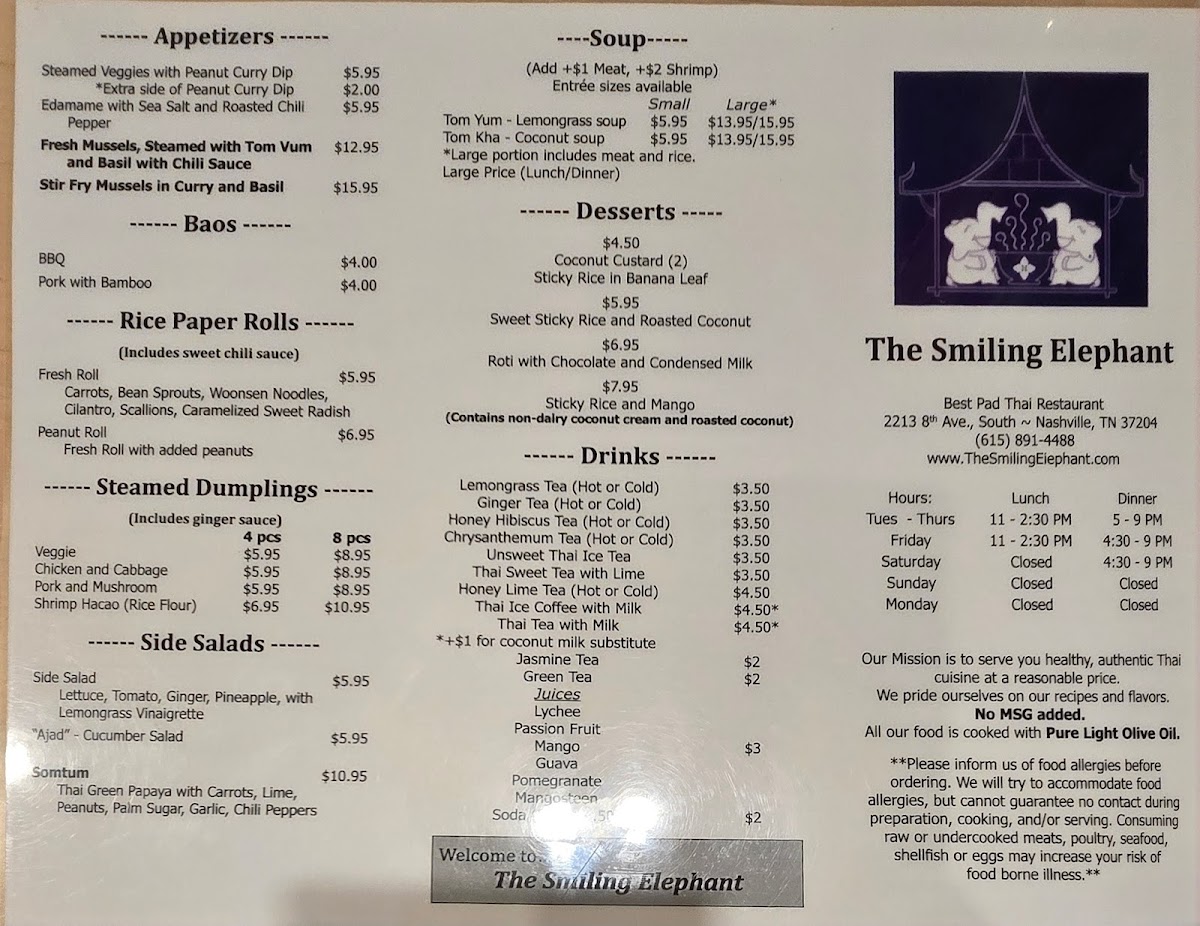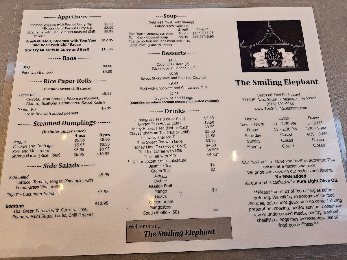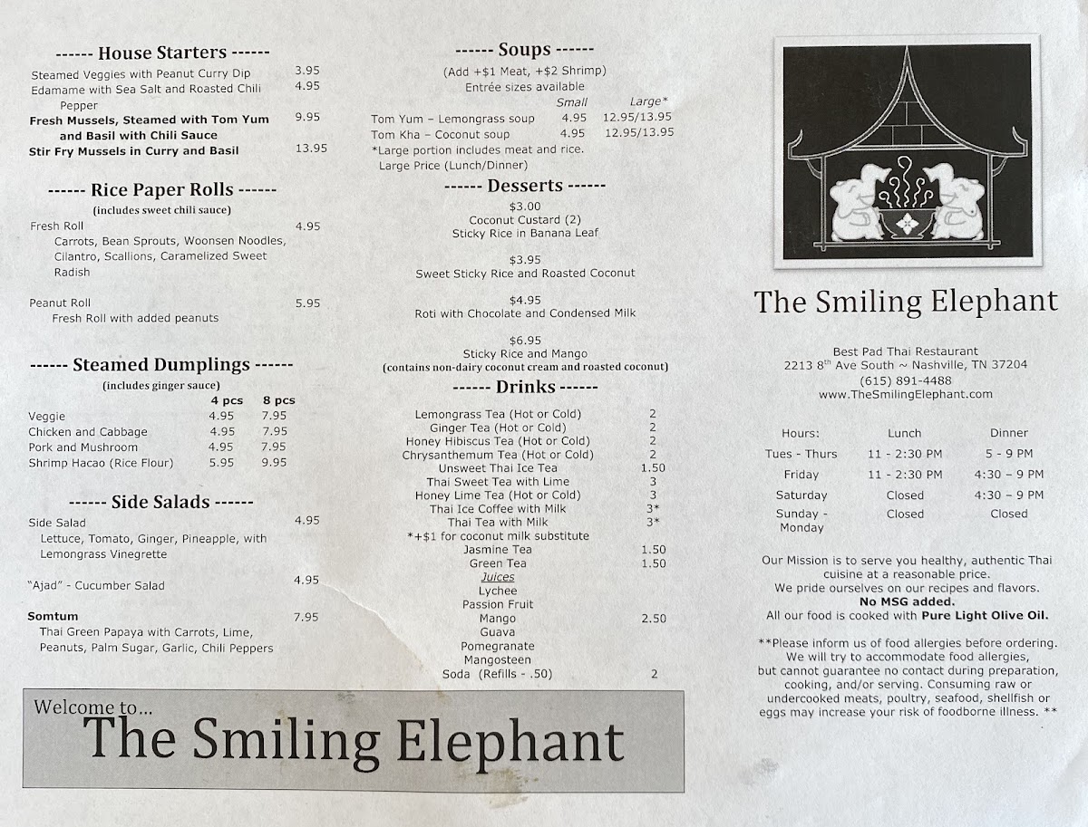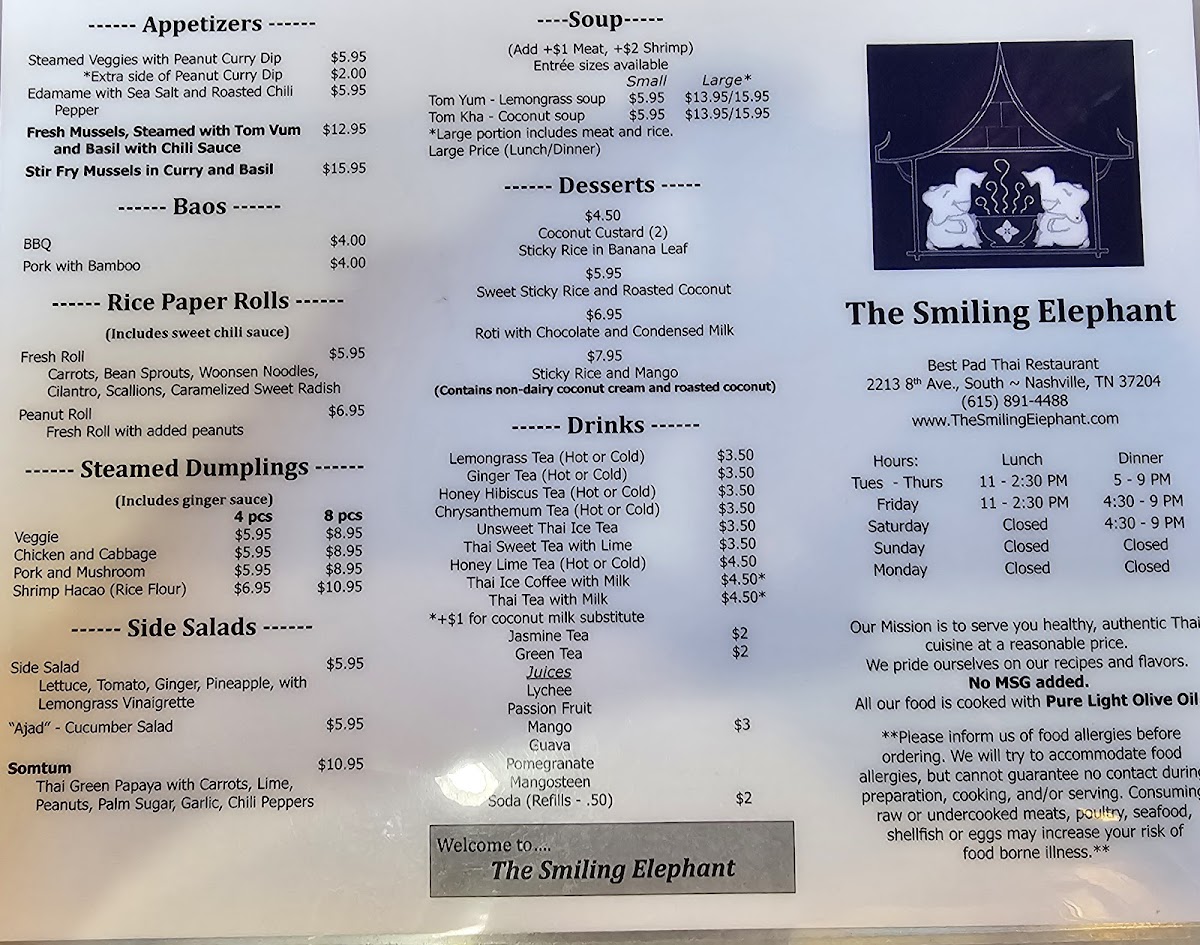 Welcome to The Smiling Elephant, a charming Thai restaurant nestled at 2213 8th Ave S in Nashville, TN. Step inside and you’re instantly embraced by its cozy, inviting atmosphere that feels less like a restaurant and more like a friend’s home. This delightful eatery is celebrated for its authentic Thai cuisine that beautifully balances bold flavors and fresh ingredients.