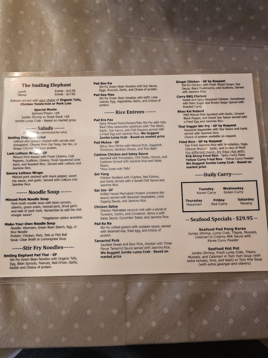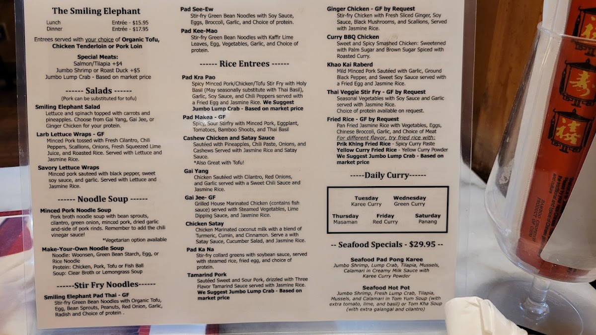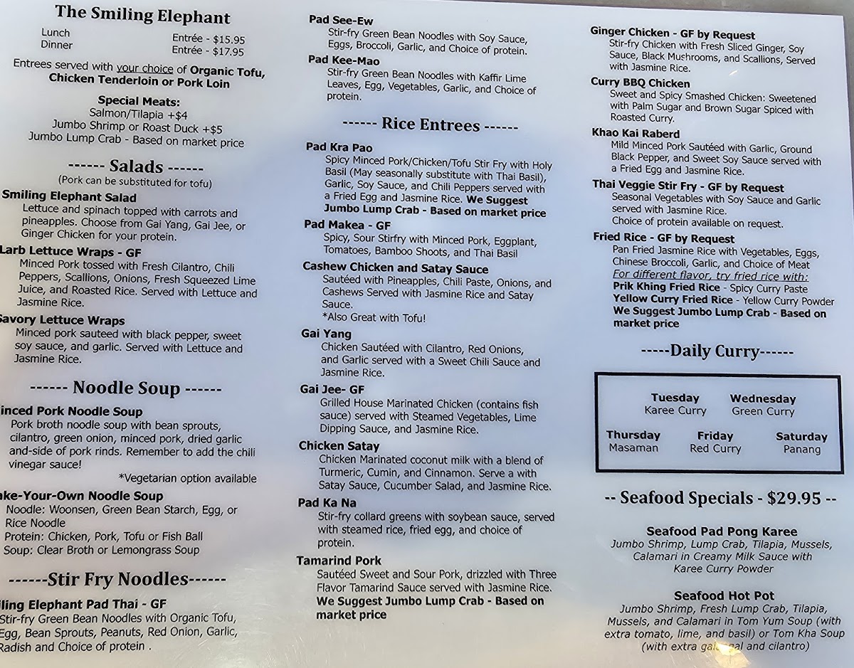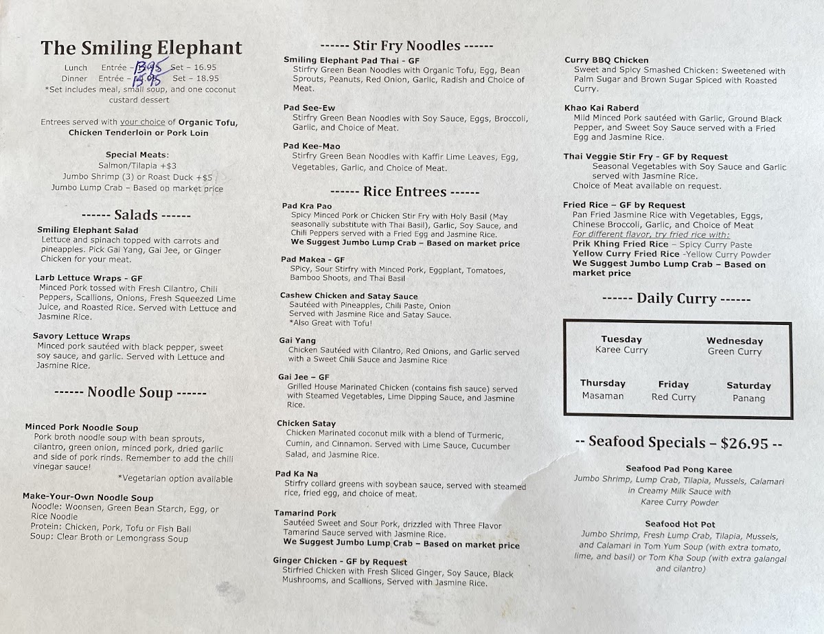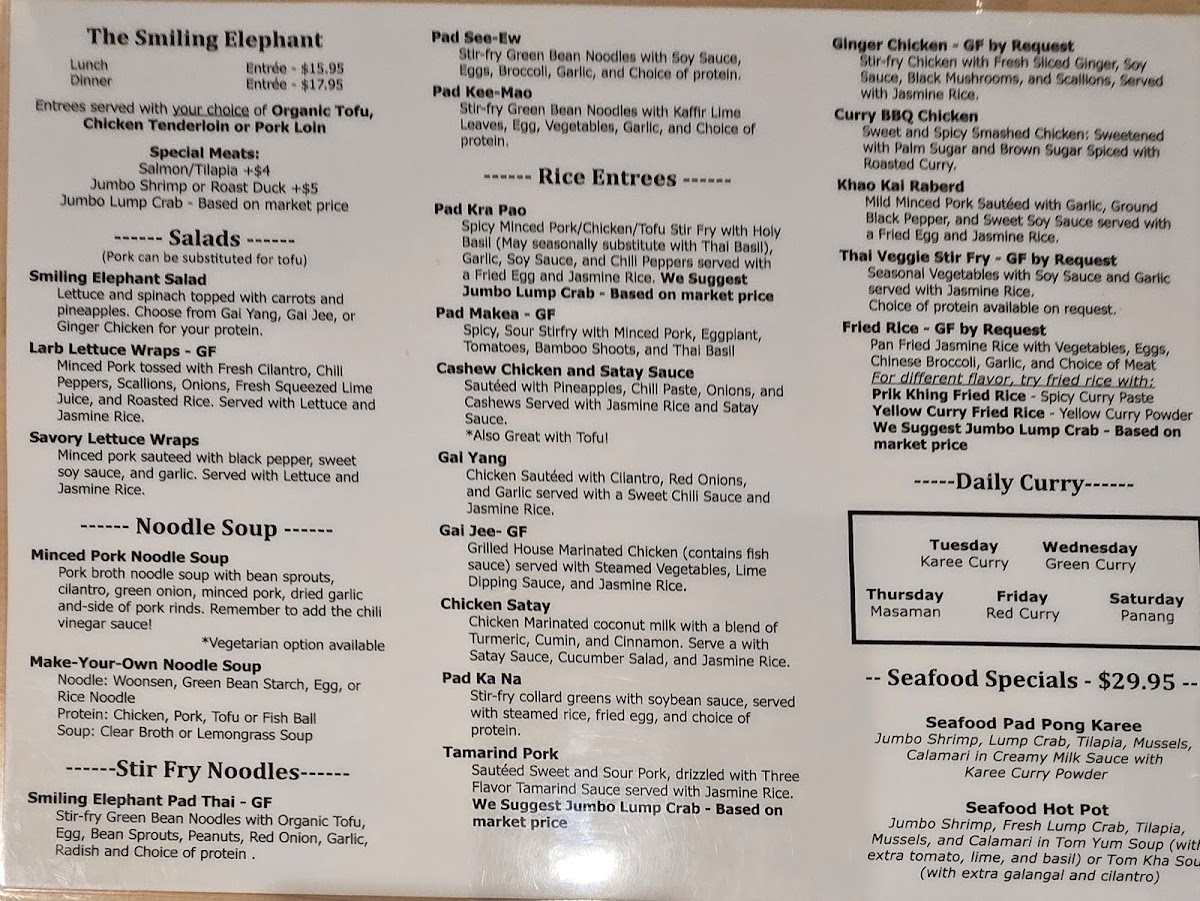 Welcome to The Smiling Elephant, a charming Thai restaurant nestled at 2213 8th Ave S in Nashville, TN. Step inside and you’re instantly embraced by its cozy, inviting atmosphere that feels less like a restaurant and more like a friend’s home. This delightful eatery is celebrated for its authentic Thai cuisine that beautifully balances bold flavors and fresh ingredients.